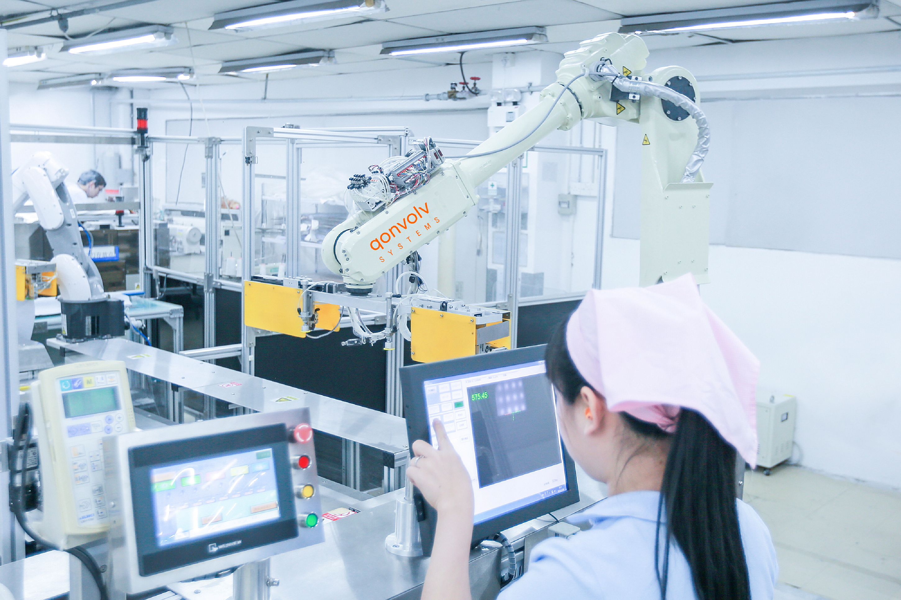“这是一台左前幅联动设备,主要是用于制作衬衫的前筒。它的优势在于能将四道工序联动合并一起做,只需要一名操作人员铺裁片就可以了。工序效率提升260%,产品质量也非常稳定。”周莹莹所说的这台设备,是由溢达与匡博智造合作研发的,像这样的智能自动化制衣设备,在他们的产线上并不少见。自动袖侧机、领四合一联动、介英四合一联动等逾50种成熟的制衣自动化设备,不仅用于本公司的生产,还实现了向全行业的推广。